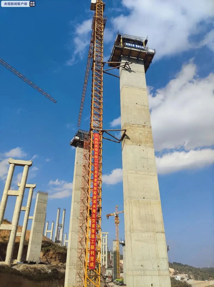 据中铁二十五局现场负责人介绍,此次浇筑完成的首根空心墩为浑水海枢纽立交桥12号墩,高度53米。浑水海立交桥空心墩施工面临地质复杂、要求测量精度极高、高墩施工安全风险高等诸多困难。为确保首根空心墩顺利浇筑完成,宾南项目部合理配置资源,从技术方案、工艺流程、安全管理等多方面对工人进行了详细交底。同时,对破桩、钢筋绑扎、墩柱立模、混凝土浇筑等各个工序全程监督、层层把控,工程技术人员、试验人员全程控制。