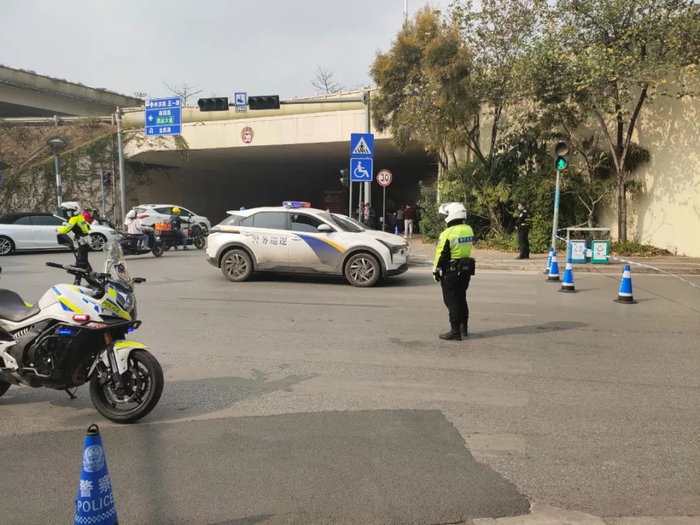 交警在立交桥下现场进行疏导绕行,并未造成交通拥堵