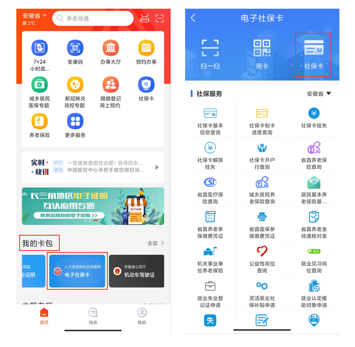 在皖事通首页“我的卡包”专区中选择“电子社保卡”(未申领电子社保卡的的用户需提前申领),点击右上角“社保卡”,进入服务页面。