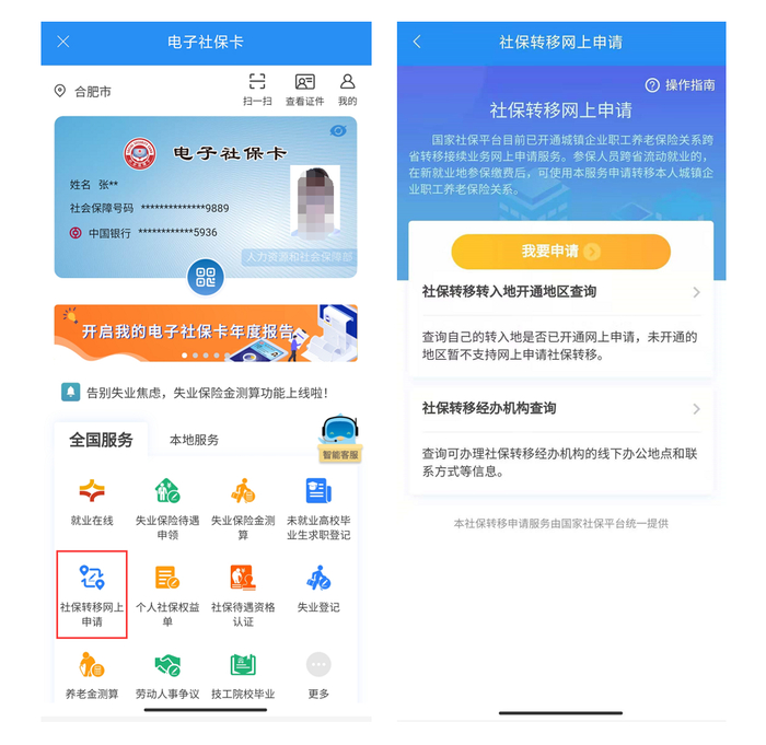 在服务页面选择“我要申请”,填写相关信息,提交申请,即可完成社保跨省转移在线申请,后续可在线查询审核结果及社保转移进度。