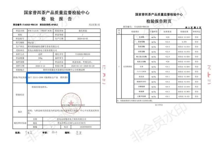 它还获得了国家普洱茶产品质检认证,均合格,为云南西双版纳《地理标志产品普洱茶》。