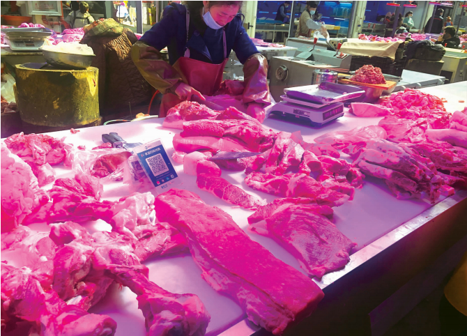 篆新农贸市场内售卖猪肉的摊位