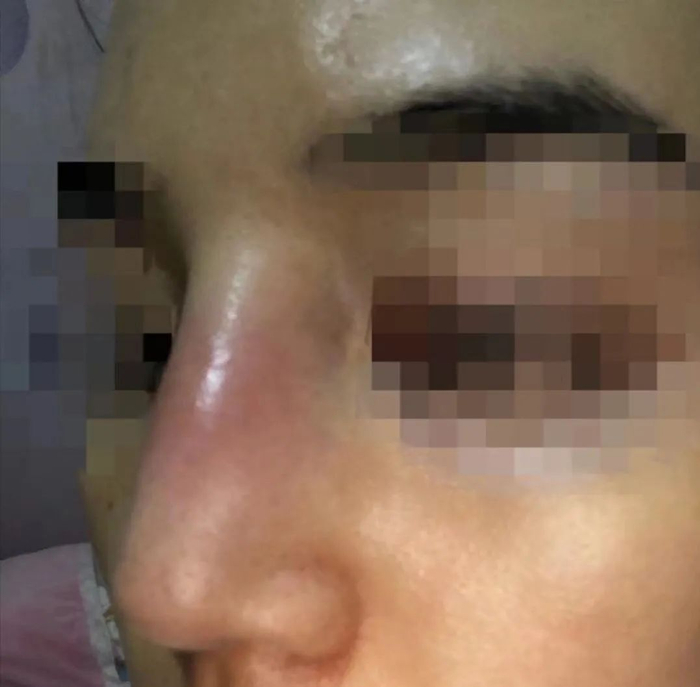 “术后一个月开始,鼻子的山根位置一直肿胀、发炎,有牵扯感,积液偶尔从鼻孔流出来。他们说可能还没有恢复好,让我打针、吃药,但是过后还是一直没有好,低头的时候感觉有东西要涌出来,鼻头也发红,严重的时候肿到眼睛位置。医生说可能是感染了,让我继续打针、吃药。”韦女士说,她一直很忌口,也不吃辣,但情况始终没有好转。医生猜测可能出现了排异反应。2019年5月,美丽在造建议将膨体取出来,做第二次修复时将材料换成硅胶。然而,重新放入假体之后,鼻子还是一直肿胀、发炎。