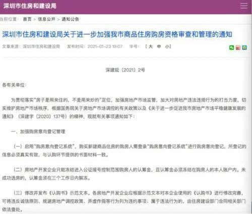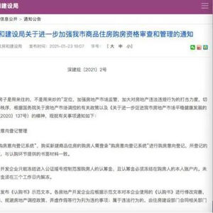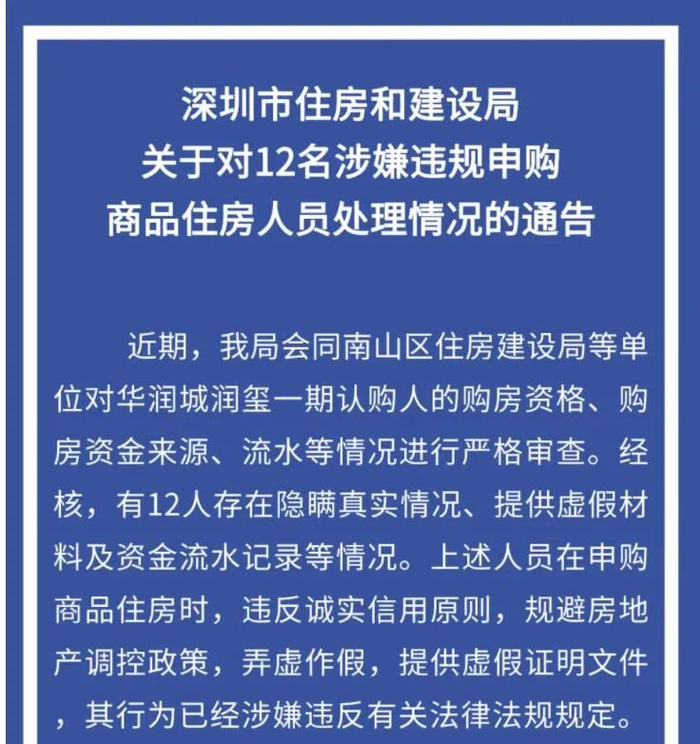 继1月22日,深圳市住建局对12名违规炒房者开出罚单后,1月23日,深圳住建局又发布了《关于进一步加强我市商品住房购房资格审查和管理的通知》,强调商品住房购房资格审查,进一步严厉打击“代持”等炒房现象。