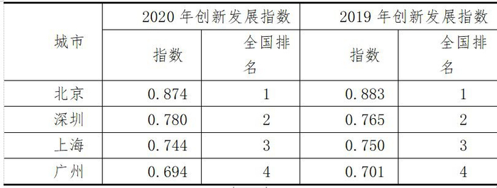具体来看,科创能力排在全国前四的北京、深圳、上海、广州的2020年科技创新发展指数分别为0.874、0.780、0.744与0.694。与2019年相比,北京科技创新发展指数有所下降,深圳、上海、广州与北京的差距分别缩小0.024、0.003、0.002,深圳科技创新能力进步显著,深圳、上海等地正在加速赶超。