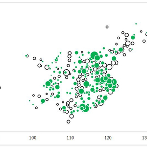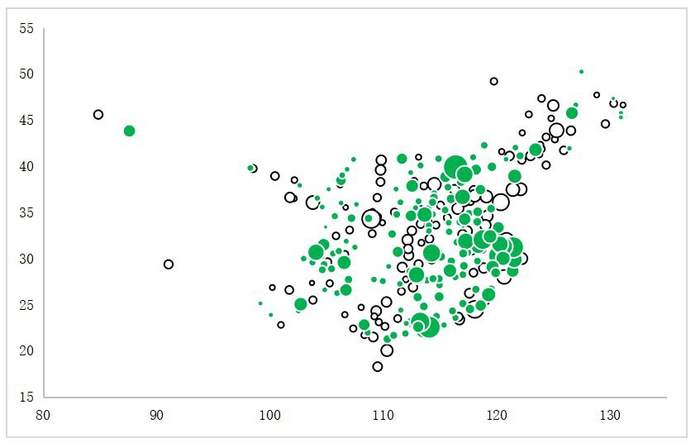 2020年城市科技创新发展指数经纬度分布图,注:横坐标表示经度,纵坐标表示纬度,图中点越大表示城市科技创新发展水平越高,绿色点表示城市科技创新发展水平排名较2019年上升或不变,白色点表示城市科技创新发展水平排名下降。
