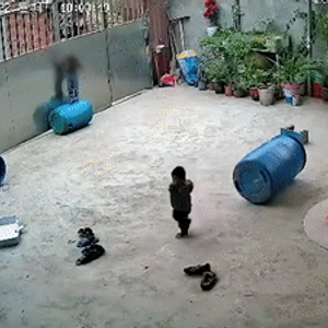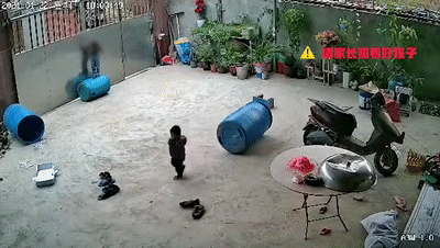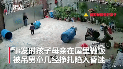 事发海南省东方市,视频显示,一名三岁男童在家中院子里玩耍时,将拴门绳套在了脖子上,由于脚下的桶突然滑走,导致男童双脚悬空,被吊在铁门上。其间,他不停踹踢铁门,挣扎了一分钟左右,男童逐渐陷入昏迷。