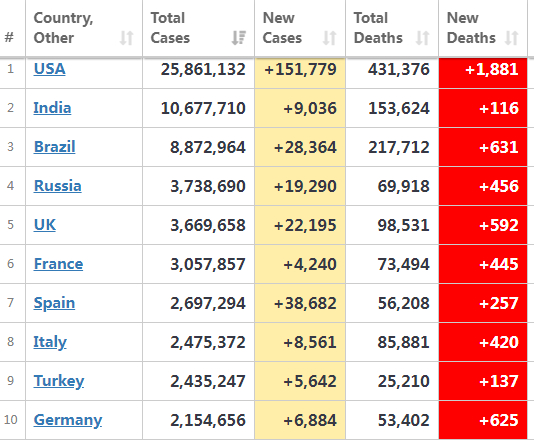 确诊病例排名前十的国家分别是美国、印度、巴西、俄罗斯、英国、法国、西班牙、意大利、土耳其和德国。