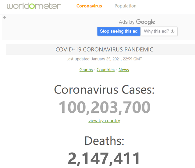 根据一直追踪全球新冠肺炎疫情的美国网站worldometer实时数据显示,截至北京时间2021年1月26日7时,全球新冠肺炎累计确诊病例已经超过1亿例,达到100203700例,累计死亡病例超过214万例,达到2147411例。