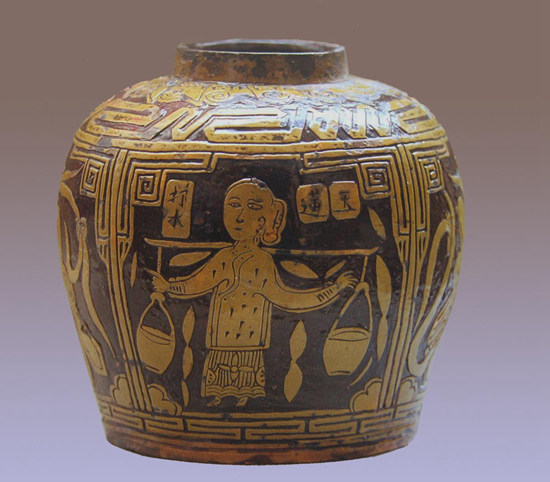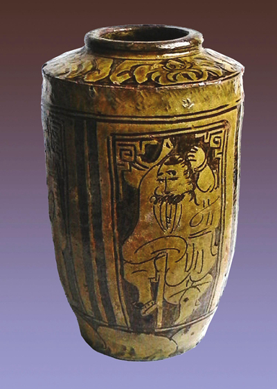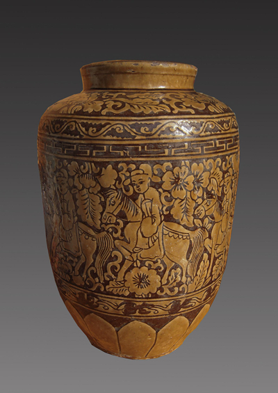马口窑陶器上的装饰,最有特色的人物题材有3种纹饰。它们是 “八仙坛”“状元打马游街坛”“十八学士坛”。“状元打马游街坛”高约47厘米,宽约24厘米,口径约14厘米。整件器物拉坯成形,施白色化妆土后采用刻划手法作满地装饰,然后用透明灰釉浸罩一层,经龙窑还原气氛烧成之后呈黄绿褐色透明釉面。色调深沉,稳重而明亮。