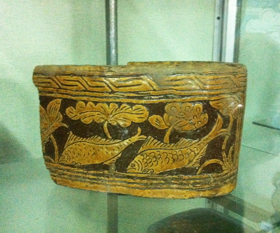 一件破损了的鱼戏莲刻花陶钵,高30厘米,宽28厘米,陶钵刻满了荷花、莲蓬、游鱼和水鸟的纹饰,充实饱满,和谐统一。用很简单而有力量的几刀,就刻出了一尾尾小鱼在水中游戏,那逗人的神态,很是让人喜爱,真是一幅生动传神而天然的“鱼戏莲”图。“鱼”“余”的谐音,含有民间流传的“连(莲)年有余(鱼)”“吉庆有余(鱼)”的吉祥寓意。这些坛坛罐罐,寄托了百姓的美好理想,希望、吉祥、幸福、美好是他们生活的一生追求,是充满乐观向上精神的体现。