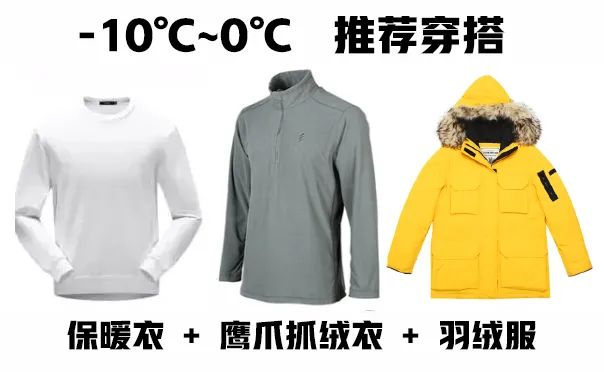 总之,户外温度0℃到-10℃的地区,可以选择保暖内衣+鹰爪抓绒衣+羽绒服。