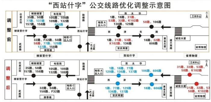 优化调整后,增设省博物馆(兰州中心)公交车站,停靠线路31路、32路、53路、58路、K102路,以上5条线路不再停靠原西站十字站点。