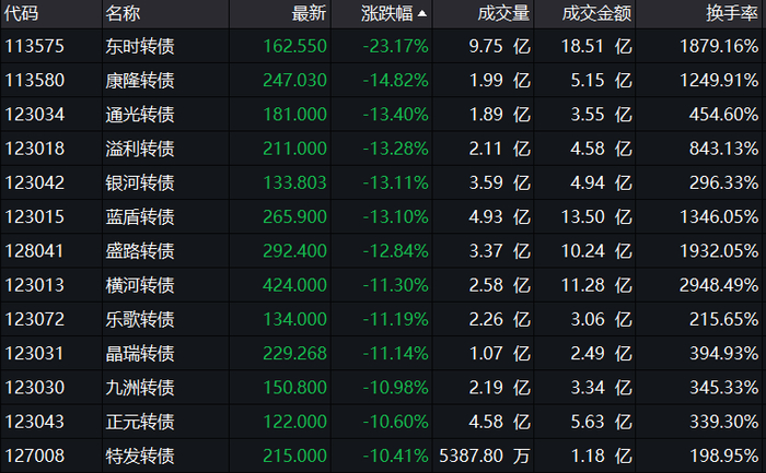 截至收盘,东时转债跌逾23%,领跌沪深两市转债,日内两次触发“熔断”;康隆转债等12只转债跌逾10%。