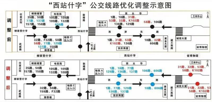 停靠线路31路、32路、53路、58路、K102路,以上5条线路不再停靠原“西站什字”站点。