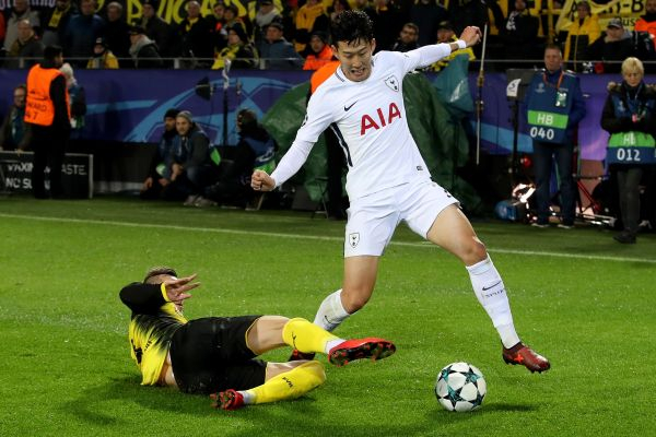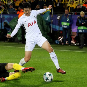 【配图】资料图:2017年11月21日,托特纳姆热刺队球员孙兴慜(右)与多特蒙德队球员亚尔莫连科在比赛中拼抢。(新华社)