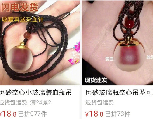 近日,一款名为“血吊坠”的饰品在电商平台热销。这种号称可以为人“挡灾”的吊坠是一款小磨砂玻璃瓶,女孩子通过扎破手指等自残方式将鲜血滴落进去,做成血吊坠送给男朋友。