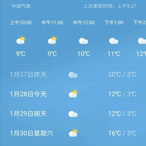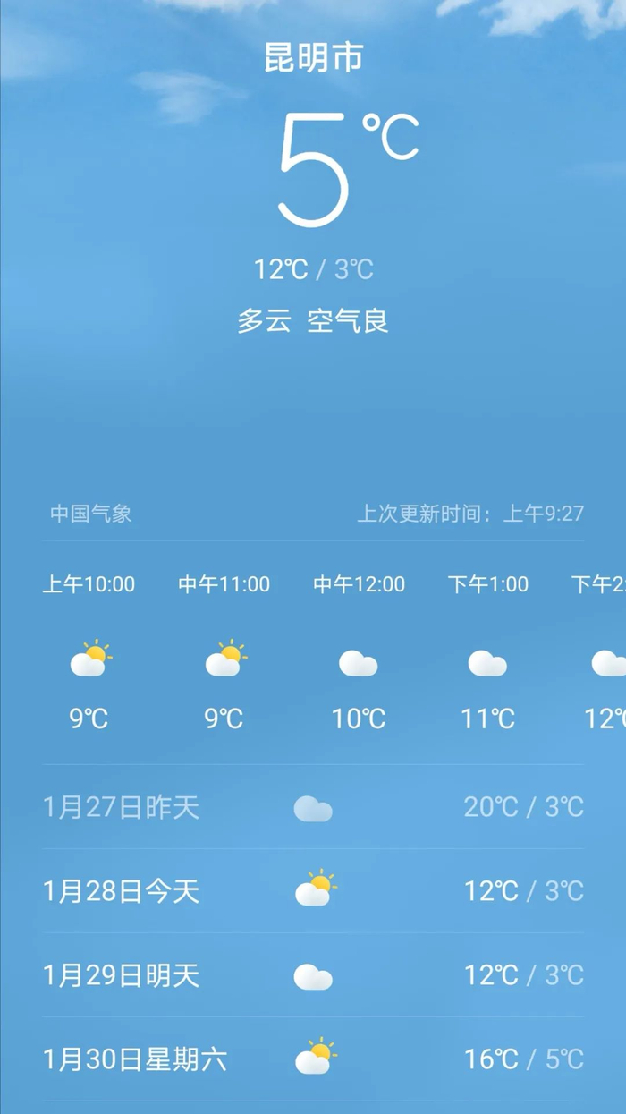 1月27日20时-1月28日20时:昭通、曲靖、文山、昆明东部、红河东部阴有小雨,其中昭通高海拔地区有雨夹雪,昆明西部、玉溪、红河西部多云转阴,其他地区晴间多云。