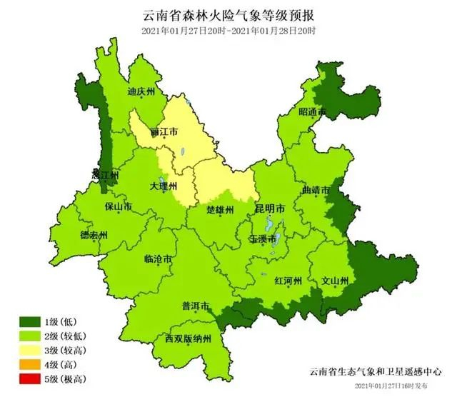 云南省森林火险气象等级未来24小时预报:丽江、大理东部、楚雄北部3级(较高),其他地区1~2级(较低)。