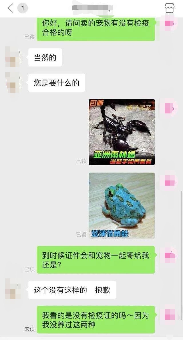 记者在某聊天群中联系上了一位异宠卖家。当记者要求提供蜥蜴等宠物托运必须有的动物检疫证明时,这位卖家表示,蜥蜴、蜘蛛等是放在盒子里快递的,不和人体接触,既不需要打疫苗,也不需要什么证明。