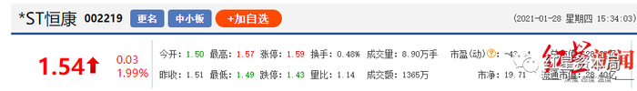 目前*ST恒康总市值21.18亿元,股价降至1.54元