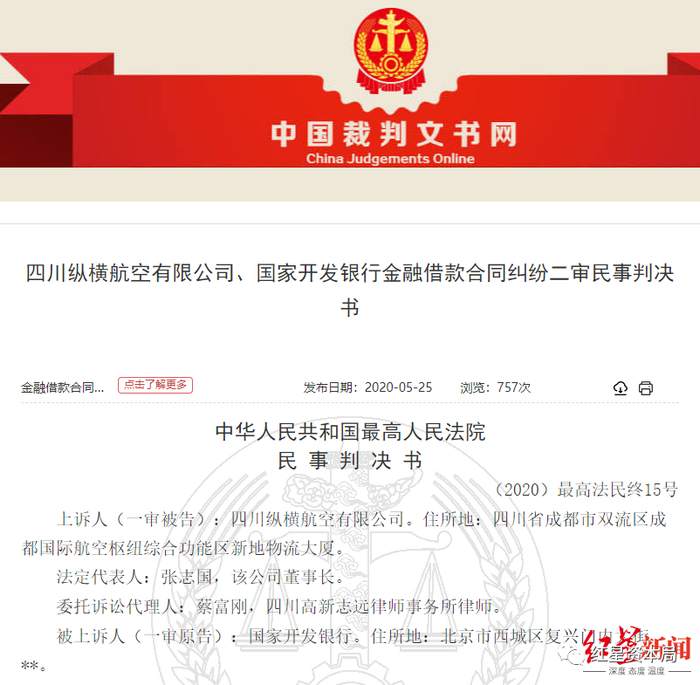 《外汇贷款合同》履行过程中,因未按约支付借款本息,2018年9月,纵横航空被起诉至法院。法院判决纵横航空偿还贷款本金6400万美元及相应的利息、逾期利息、复利等。国家开发银行有权对上述用于抵押的2架湾流高端公务机折价或者以拍卖、变卖该抵押物的价款优先受偿。2020年3月,最高人民法院终审维持原判。