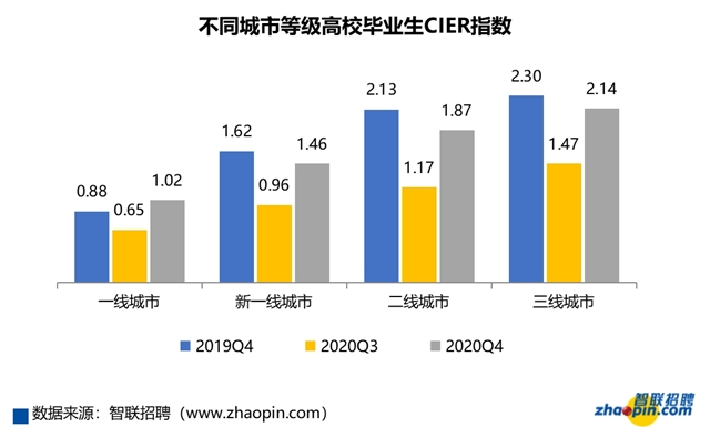 2020年四季度高校毕业生的就业景气指数呈现一线、新一线、二线和三线城市依次递增的趋势。其中,一线、新一线城市的就业指数分别为1.02、1.46,就业竞争相对激烈;而二线、三线城市就业景气指数为1.87和2.14,就业市场相对宽松。