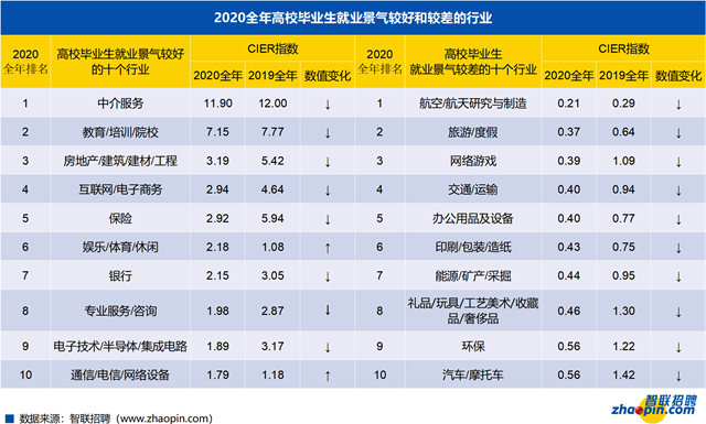 报告显示,2020年中介服务、教育培训、娱乐休闲、咨询等新兴服务业保持领先,尽管与去年相比就业景气指数有所下降,但降幅相对较小。此外,半导体、通信等新基建行业在本年度的就业景气也相对较好。随着以5G、人工智能、工业互联网为代表的“新基建”成为国家重点投入的发展领域,相关行业的人才缺口也逐渐凸显,成为潜在的就业增长点。