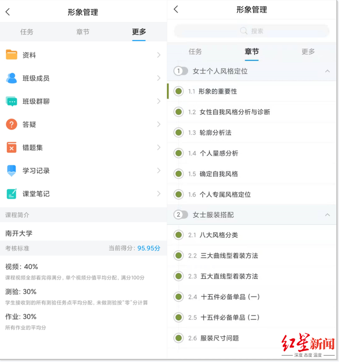 红星新闻记者以一位学生的账号登录“学习通”APP后,在王红的“形象管理”课程中发现,其中包括11个章节,分别讲述如何进行形象管理、礼服知识、化妆、中餐西餐礼仪等。