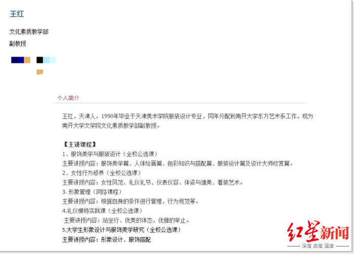 红星新闻记者在南开大学文学院官网查询后发现,王红属于文化素质教学部,职称为副教授。其主讲课程包括:服饰美学与服装设计、女性行为修养、形象管理、礼仪模特实践课、大学生形象设计与服饰美学研究。