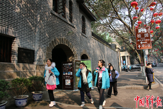 1月22日,重庆市中山四路,几名学生从桂园门前经过。重庆谈判期间,毛泽东曾在这里会见各方人士,“双十协定”也在这里签署。 中青报·中青网记者 王鑫昕/摄