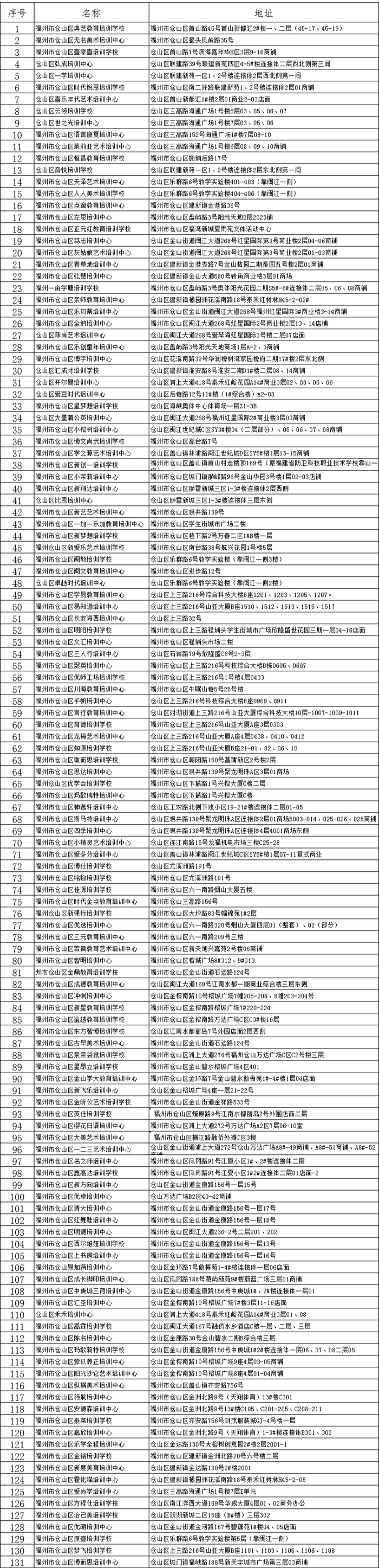 | 福州市鼓楼学大教育培训学校台江校区 | 台江区玉环路10号中亭街改造利生苑A区8#楼4层 |