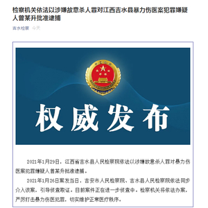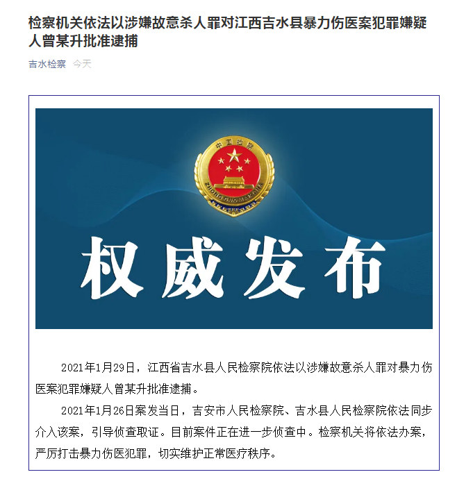 2021年1月29日,江西省吉水县人民检察院依法以涉嫌故意杀人罪对暴力伤医案犯罪嫌疑人曾某升批准逮捕。