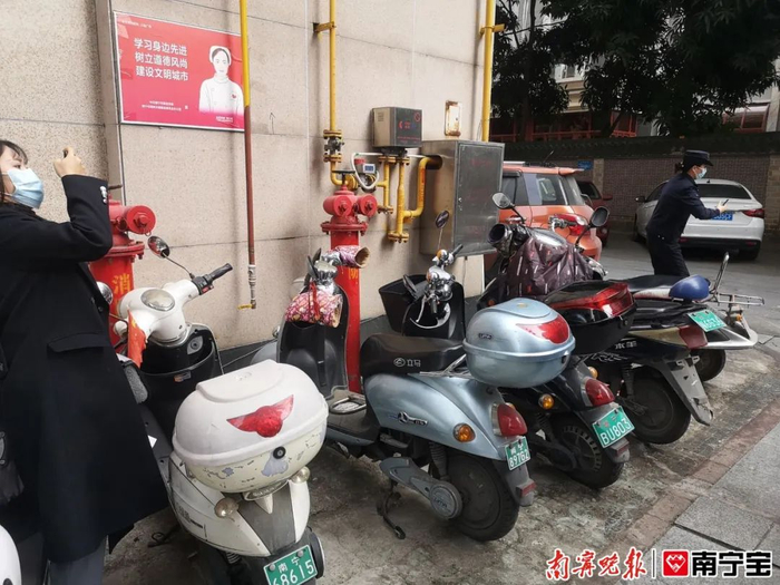 在整治行动过程中,除了电动自行车充电不规范问题,消防安全问题也存在隐患。大厦楼体旁的消防设施(接水)和燃气设施前均停放有电动自行车,一旦发生电动自行车起火事件,后果将不堪设想。整治队伍要求物业当即将车辆移除,并作出建设栅栏等保护措施的意见。