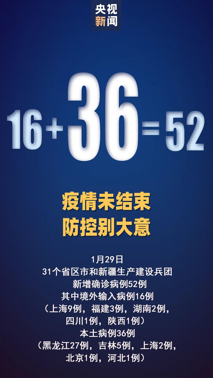 国家卫健委今天通报,29日0时至24时,31个省(自治区、直辖市)和新疆生产建设兵团报告新增确诊病例52例,其中本土病例36例(黑龙江27例,吉林5例,上海2例,北京1例,河北1例);新增无症状感染者16例(境外输入8例);当日转为确诊病例7例(境外输入2例)。