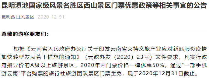根据《云南省人民政府办公厅关于印发云南省支持文旅产业应对新冠肺炎疫情加快转型发展若干措施的通知》(云政办发(2020)23号)文件要求,凡实行政府指导价的A级以上旅游景区,2020年内门票价格一律优惠50%,通过“一部手机游云南”平台购票的旅行社旅游团队景区门票全免,现于2020年12月31日截止。