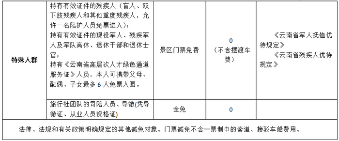 5.持有《云南省高层次人才绿色通道服务证》人员,本人可携父母、配偶、子女最多6人免票入园。