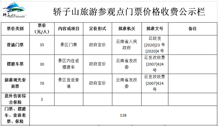自2021年1日1日起,轿子雪山景区恢复门票价格,普通门票35元/人,摆渡车票30元/人,旅游观光索道票70元/人。