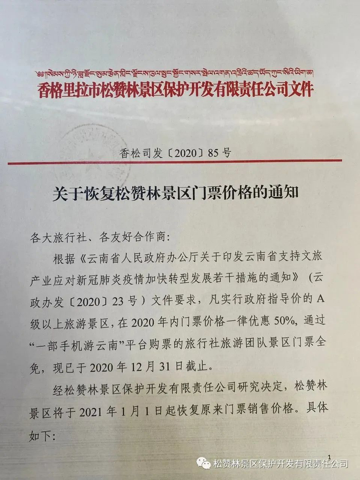 根据《云南省人民政府办公厅关于印发云南省支持文旅产业应对新冠肺炎疫情加快转型发展若干措施的通知》(云政办发[2020]23号)文件要求,为支持全省文旅企业有效应对疫情影响,实行政府指导价的A级以上旅游景区,年内门票价格一律优惠50%,对旅行社组织的旅游团队通过“一部手机游云南”平台购票的,景区门票全免,此价格政策已于2020年12月31日到期。为便于各旅行社、渠道商、提前做好价格调整的相关准备工作,同时方便游客朋友们安排好出行计划,现公告如下: