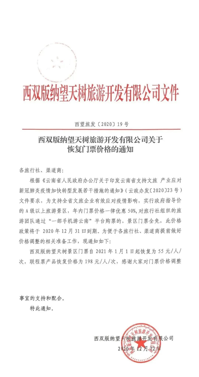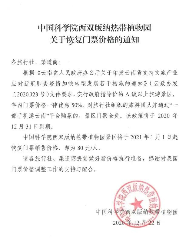 根据《云南省人民政府办公厅关于印发云南省支持文旅产业应对新冠肺炎疫情加快转型发展若干措施的通知》(云政办发〔2020〕23号)文件要求,实行政府指导价的A级以上旅游景区,年内门票价格一律优惠50%,对旅行社组织的旅游团队并通过“一部手机游云南”平台购票的,景区门票全免。该政策已于2020年12月31日到期。为便于各旅行社、渠道商提前做好价格调整的相关准备工作,同时方便游客朋友们安排好出行计划,现公告如下: