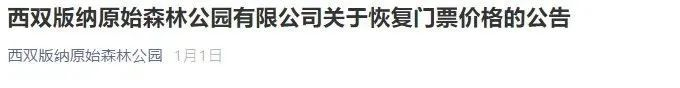 西双版纳原始森林公园门票价格恢复至全价票45元/人。