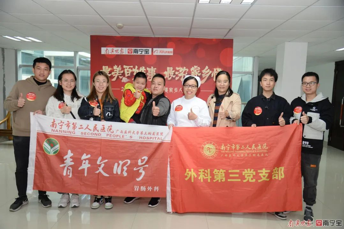 上午9时许,陆续来到颁奖现场的十大“最美家乡人”及他们的亲友团们,在背景板前合影留念。“‘最美百姓事,最浓家乡情’!市二医院胃肠外科最棒!”市二医院胃肠外科潘林媛的亲友团共来了8人,同事们还带来了青年文明号和外科第三党支部的旗子一起合影。