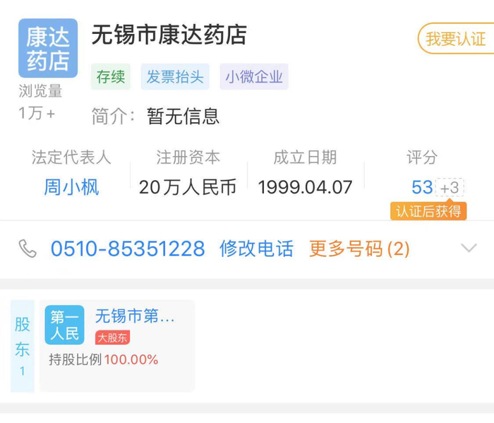 记者在“天眼查”查询看到,无锡市康达药店成立于1999年4月,股东是无锡市第一人民医院,持股比例100%。无锡市第一人民医院已经在2007年与儿童医院等整建制组合,成立了无锡市人民医院。