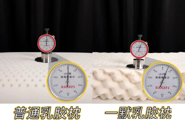 分别测试了一下两个枕头的硬度,普通乳胶枕的硬度几乎为零,一默枕头硬度稍大,支撑力较强。