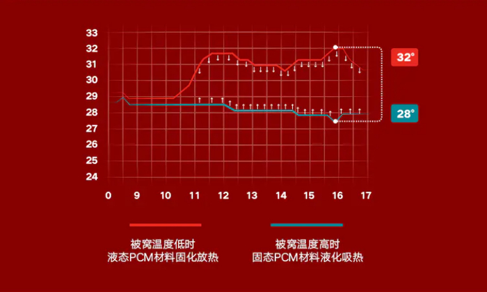 它结构和棉纤维相似,但比棉更柔软,控温用的PCM相变材料包裹在纤维内部,如同微空调”一样实时调节温度。