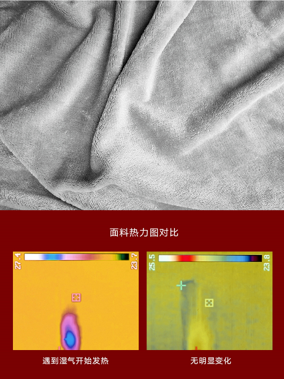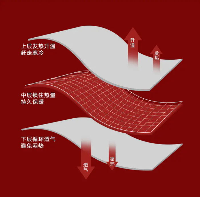 上层,采用美兰绒面料。它的纤维可吸附人体释放的游离水分子,将其动能转成热能。