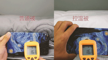 将两块43℃的板子放进两款被子里,一分钟后,普通棉被只下降了2℃,温度在 41℃ ,而控温被整整下降了6℃,直降到37℃,是普通棉被的3倍!