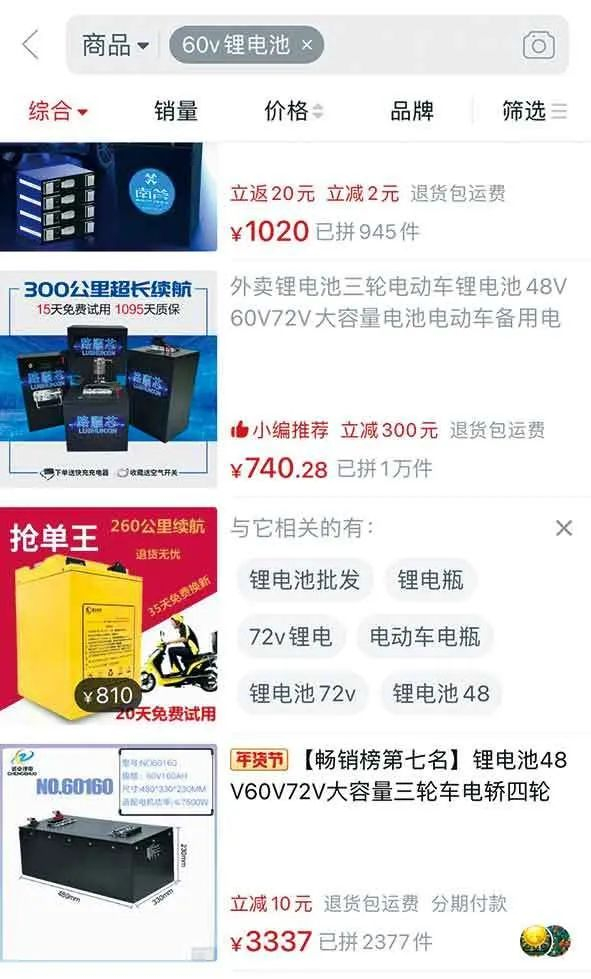 尽管如此,在几大主流电商平台上,均有多款不合规电瓶在售卖,价格在几百元至上千元不等,其中部分产品还登上了电动车零售配件专区的热卖榜。“电池好装自己搞定”“电池续航强劲”“再也不用一天充好几次电了”“电池得劲适合跑外卖的”……在买家评论区,购买60V、72V等电动自行车电池的用户们对于这些违规电瓶“好评如潮”。