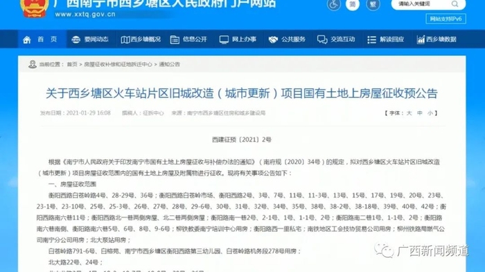 《关于西乡塘区火车站片区旧城改造( 城市更新 )项目国有土地上房屋征收预公告》显示,本次征收国有土地上房屋及附属物的范围涉及衡阳西路南铁片区、北大路、秀灵路、友爱路、中华路等路段,征收的土地范围达到5000亩左右。像白苍岭市场、南宁市华衡小学、南铁片区的桂花苑、玉兰苑、牡丹苑等小区都在征收范围内。