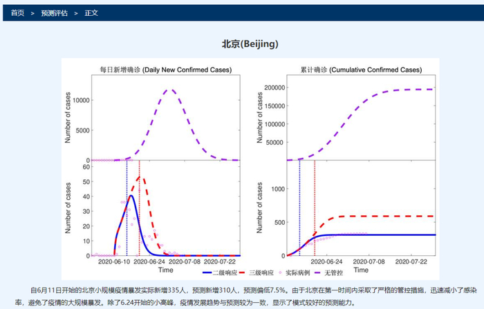 2020年6月,针对北京发生的聚集性疫情,钟南山表示,由于采取强化核酸检测和对病例细致的追踪等强有力措施,北京的疫情目前得到了有效控制。兰州大学的一个模型的预测,假如没有任何的干预,大概在同样的时间,北京会传播20万人。这就是我们在中国进行很有力的这种防控措施所取得的结果。